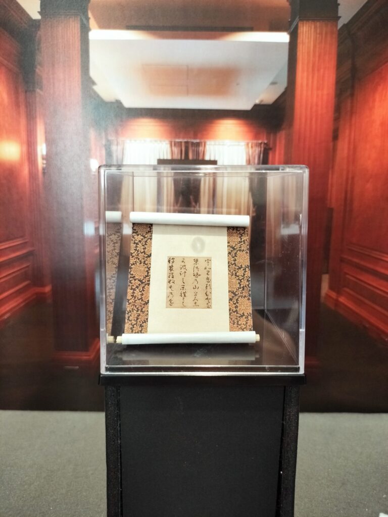 」を写した茶室に、茶道具一式を取り合わせた展示)では、床の間に伝後鳥羽院とされる和歌懐紙「古郷草花」の書が飾られ、それらと共に御所丸茶碗や菊蒔絵大棗が飾られている。本展のメインである「熊野御幸記」に沿って、天皇にゆかりある品、あるいはそうした宮中の世界を彷彿とさせる取り合せとなっている。備前水指も銘が「さざれ石」。