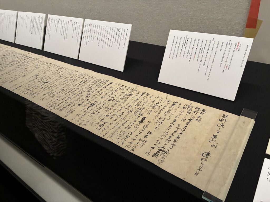 そして、本展の最大の目玉である「熊野御幸記」。藤原定家が後鳥羽院の4回目の熊野御幸に同行した際の、いわば旅ログ。京を出てから戻って来るまでの23日の様子が記録されており、乱筆だったり、書き損じたりしている箇所もあり、生々しい。